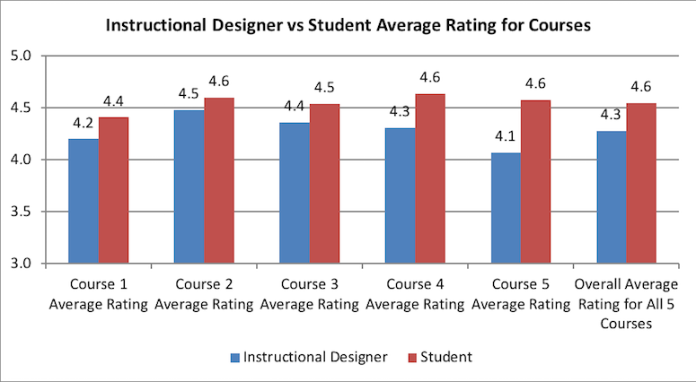 Charts 1 shows the average rating results for each of the five courses from both the instructional design and student perspective. The average score is an average rating of quality standards by instructional designers and students, respectively, regarding categories of General Course Information, Course Goals and Learning Outcomes, Learner Assessments, Course Materials, Learning Activities, Course Technology, and Course Look and Feel.