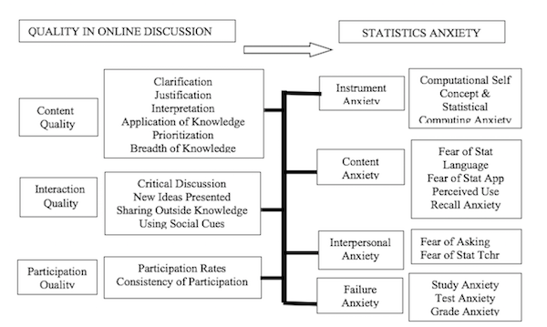 The current study focused on the use of online discussion forums/boards with the specific types, content and characteristics of the discussions as the independent constructs, and variables examined in the study and students’ statistics anxiety constructs and variables as the dependent considerations in the study exemplified in the discussion of the conceptual framework section description and schematic (Nandi, Chang, and Balbo, 2009; Onwuegbuzie and Wilson, 2003). Multiple researchers have examined the effectiveness and use of discussion boards within online teaching and learning environments (Biriyai & Thomas, 2014; Orlando, 2017; Song & McNary, 2011). Biriyai and Thomas (2014) referred to the “moderator” (instructor) as the manager of the discussion forum emphasizing the effectiveness of the moderator as the key individual who “directly impacts the quality and usefulness of the forum in general, its appeal, and its usefulness as a community of interrelated users” (p. 113). Zhou (2015) outlined several key factors highlighting instructor interactions with students within online discussion boards: (a) instructor feedback was highly valued by students; (b) instructor feedback over time positively influenced students’ participation; and (c) instructor supportive feedback positively influenced students’ interaction quality and quantity over time. Zhou (2015) also suggested two key areas of need for further research focused on using online discussion boards: (a) virtually all of the meta-analysis studies reviewed by Zhou (2015) were qualitative suggesting a critical need for quantitative research and (b) the meta-review by Zhou (2015) indicated the “need for more empirical studies investigating students’ perceptions and performances” (p. 197). The need for connecting discussion boards or students’ online posted discussions as the independent variable within a quantitative study to students’ reactions or performance levels has been reflected in prior literature by the following exemplars: (a) Song and McNary (2011) examined discussion board posts for student interaction variants, such as students’ changes in posting types, length, and number over time, and relationship to students’ grades in the course; (b) Hong and Kao (2017) determined three patterns of statistics students interacting online, i.e., (1) students interacted for the purpose of completing tasks within a specified timeframe; (2) students interacted online for the purpose of exchanging answers; and (3) students interacted online for the purpose of gaining knowledge; and (c) Gilbert (2015) emphasized the advantage of students interacting within online learning environments as the following: “Online learning has the ability to disassemble barriers that have been constructed by poverty, location, disability, as well as other factors.” (p. 28). These focused literature sources exposing the strong influence of discussion boards in student learning online substantiate the use of online discussion boards as a key influence in student learning within online learning environments. The current study utilized discussion boards as an empirically based independent variable for conducting quantitative research focused on the examination of relationships among discussion board assessments scores and students’ statistics anxiety levels within a graduate education statistics course.