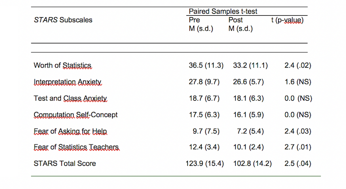 Table 2: Means and standard deviations of pre- and post-STARS (Baloglu, 2003) scores with subscales and associated dependent t-values and p-values.
