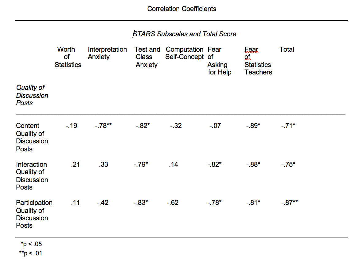 Results depicted in Table 3 offer educators and researchers specific areas of focus for discerning the kinds of online discussion forums conducive to supporting positive environments for the teaching and learning of educational statistics within graduate educational statistics courses. Significant (p < .05 and p < .01) relationships were found between students’ quality of discussion forum posts and students’ statistics anxiety levels relative to multiple subscales. Quality of students’ content depicted within discussion posts was found to be inversely related to students’ interpretation anxiety levels relative to interpreting statistical analyses results; inversely related to students’ test and class anxiety levels; inversely related to students’ fears of statistics teachers; and inversely related to students’ overall statistics anxiety (total scores on the STARS). Quality of students’ interactions with others depicted within discussion posts was found to be significantly (p < .05 and p < .01) inversely related to the following statistics anxiety scales from the STARS: (a) students’ statistics tests and statistics class anxiety levels; (b) students’ fears of asking for help with statistics; (c) students’ fears of statistics teachers; and (d) students’ total scores on the STARS reflecting overall statistics anxiety levels. Quality of students’ participation in the advanced educational statistics course was found to be significantly (p < .05 and p < .01) inversely related to multiple statistics anxiety scales depicted by the STARS subscales as follows: (a) students’ anxiety levels concerning statistics tests and statistics classes; (b) students’ anxiety levels associated with students’ fears of asking for help in a statistics course; (c) students anxiety levels associated with students’ fears of statistics teachers; and (d) students total anxiety scores on the STARS. This sound empirical connection of the assessments of quality of discussion forums respective of individual students’ scores on specific subscales of the STARS provides strong evidence regarding the interrelationships of online discussions and graduate education students statistics anxiety levels. In addition, these results propel an in-depth purpose for future studies to examine the implications of the study findings for graduate statistics education.