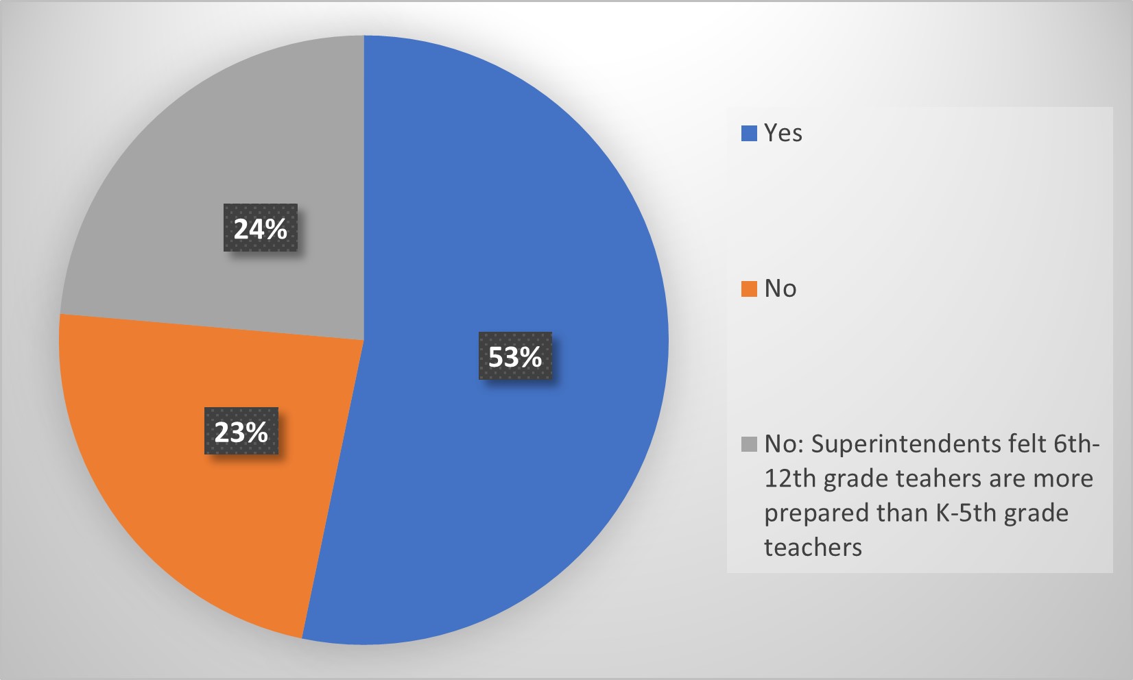 Superintendents were asked if they felt that faculty and staff were prepared for distance learning during the pandemic. Fifty-three percent (53%) felt that their faculty and staff were prepared. Of the 47% that said no, half of them felt that faculty at the secondary level were more prepared than K–5 teachers. Many superintendents commented that teachers in grades 6–12 had a better understanding of using digital learning platforms to drive instruction and teachers in grades K–5 had little or no experience.