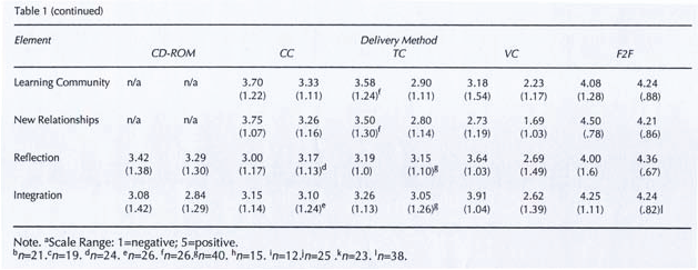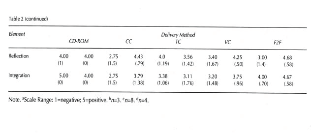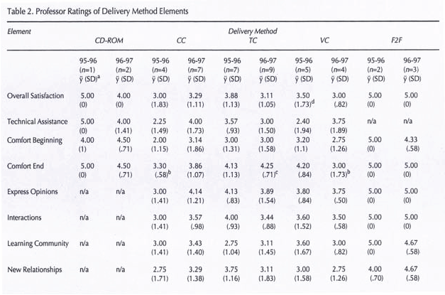 In the second year, all elements met the criterion () for each delivery method except VC. Professors explained that they had developed more expertise with the various media as well as with the overall program: “The new `village’ was excellent, well run, and the people a pleasure to deal with.” They had also participated in planned orientations to the technology and received ongoing technical support. Like the graduates, professors in both years were most satisfied with the F2F medium.