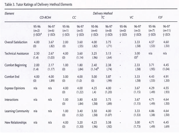 As with the graduates and professors, all delivery methods were not used by every tutor. They rated only those they used in the program. In both years, tutors rated the F2F method most positively on almost every element (see Table 3), and because they had most contact with students in laboratory practice and tutorial sessions, this was not surprising. In the first year, comfort with each of the media increased from the beginning to the end of the program. Computer conferencing received a rating that did not meet the criterion for 5 of 10 elements; however, this finding should be viewed with caution as there was only one respondent. There was an evident change in 1996-1997 for this medium as all but one element met the criterion.