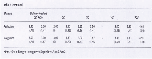 Graduates also indicated that all media provided time and space for reflection and integration of learning, although F2F offered the greatest opportunity. Their ratings for the CD-ROM program for Pathophysiology did not meet the criterion for integration (M=2.84 (1.29) in the second year. They were positive about the program, and one remarked, “It was excellent in explaining visually `before your eyes’ pathophysiology that would be difficult to conceptualize from reading a text.” However, several graduates in both classes admitted they were unable to find time to complete this optional supplemental learning program due to the heavy courseload and other responsibilities. One student commented, “Downfall, too heavy in one program/course re Patho and multimedia; test, workload, conference, courseware etc. ... meant some means were sacrificed.” They felt there was insufficient time in their schedules to make use of optional learning resources. Focus group data confirmed these observations.
