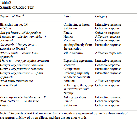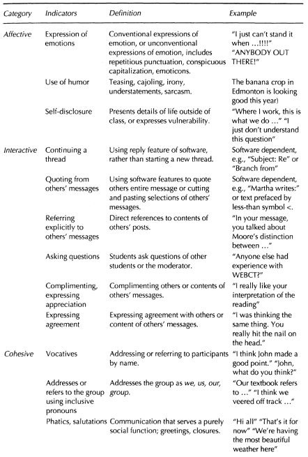 An important step in content analysis is the development of categories and indicators that researchers can then use to analyze the transcripts. We arrived at the categories for social presence that we used through an iterative process. First, behavioral indices were derived from the three categories of social presence articulated by Garrison et al. (2000, i.e., emotional expression, open communication, and group cohesion). Second, indicators of social interaction that had been derived from the media capacity, teacher presence, and group interaction literature were applied deductively to the analysis. Third, additional indices were deduced from careful readings of the transcripts and then added to the coding scheme. This process culminated in the formation of three broad categories of communicative responses that contribute to social presence. These categories correspond directly to Garrison et al.’s original categories. However, they were relabeled to reflect better the nature of the emergent indicators that define them in this study. Open communication is now referred to as interactive responses, referring to indices of threaded interchanges combined with messages of a socially appreciative nature. Emotional presence has been renamed as affective responses and group cohesion as cohesive responses. Considering the exploratory nature of this study, assignment of indicators to categories is tentative. Further work using factor analysis is underway to confirm the existence of these three separate, although not necessarily orthogonal, categories of social presence. Each category is further described below and the indicators in a CMC environment are identified in italics.