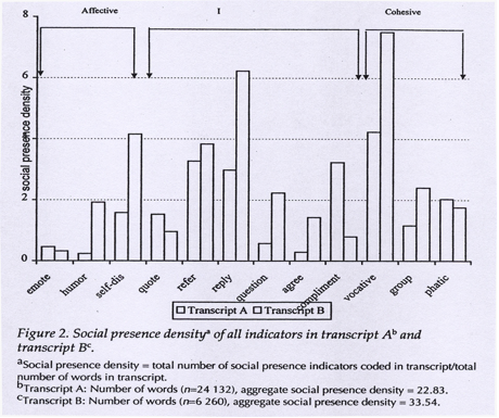 At the level of indicators, transcript B had higher social presence density ratings for all but three of the 12 indicators: complimenting, phatics, and salutations, and quoting directly from the transcript. Discourse analysts Eggins and Slade (1997) offer a possible explanation for this inconsistency. They use as an example an old married couple to illustrate the point that among people who share strong interpersonal bonds, superficial and formal social expressions (e.g., salutations, compliments) are less frequent and less necessary than among people who share transient or weak interpersonal bonds. Comments made by computer conferencing students offer some support for this interpretation. Results from Angeli et al.’s (1998) study of a computer conference support this hypothesis. They found that the incidence of purely social interaction, which they defined as statements that were not focused on the content of the course, declined significantly as the conference progressed and the students came to know one another better. For example, the students that Fabro and Garrison (1998) surveyed reported, “The cohort was generally conditioned in many ways to be polite and disagreement was taken as a personal affront. This group appeared to be quite timid and began to just agree with each other rather than challenge each other’s ideas” (p. 48).