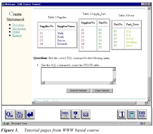 To engage and motivate the students, tutorial questions (similar to that in Figure 1) were integrated into the modules where appropriate. Questions were to be completed and submitted online. A significant feature of the system was that it provided direct access to a real “commercial” database system. The toolbar offered an icon that allowed students to issue database queries. The idea was to deliberately blur the distinction between the educational environment and the “target” systems. This feature encouraged students to “try out” various parts of the course before attempting a larger project. The course provided several project specifications that had to be chosen and implemented by the students. Doing them via the educational interface provided better pedagogical support for the project implementation.