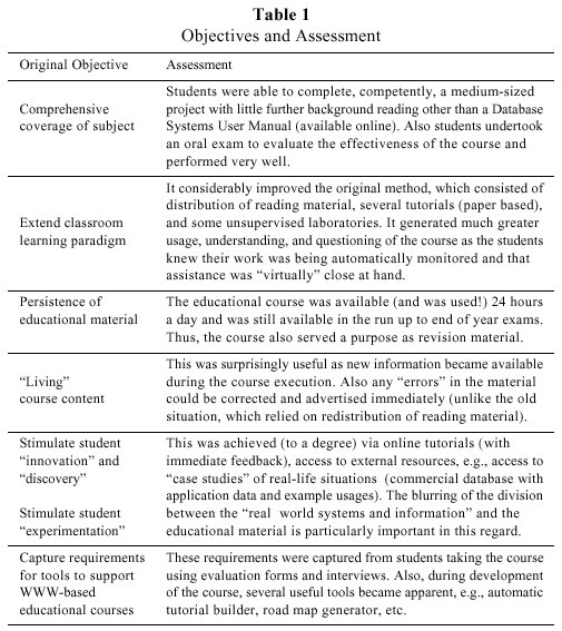 Our experience has shown significant benefits in using WWW technologies in a university environment. It has also demonstrated that an iterative approach to course design, feedback, and redesign/extension is very important. This approach involves significant work-hence the need for tools to support the process. Our future research will involve enhancing the existing course by including adaptivity features and developing appropriate tools. They would include tools for the automatic generation of tutorial questions and roadmaps for different applications of the material. The overall aim is to remove as much of the manual work from the educators and course developers as possible, thus freeing them to concentrate on the more important pedagogical aspects.