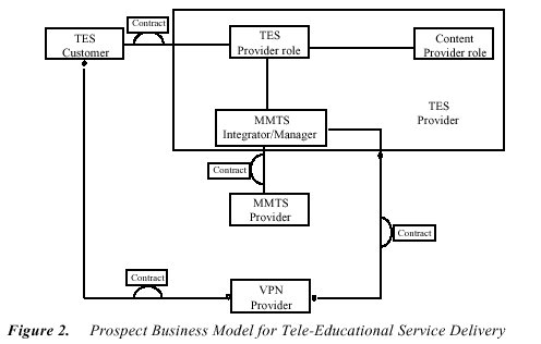 Figure 2 identifies the various roles that are possible in a Open Market driven tele-education service. The Tele-education Service (TES) Customer represents the end-user organizations of the tele-education services. Tele-educational Service Provider is the organization that provides the tele-education services and combines various multimedia tele-services along with appropriate content to support participants on a course. The Tele-educational Content Provider is responsible for the development of the educational content. Development can be done by the TES provider or out-sourced. The business model in Figure 2 captures the requirements of both situations. The Multimedia tele-service (MMTS) Integrator/Manager is responsible for the integration and management of tele-services. Services can be offered by the TES provider or out-sourced. The Multimedia Tele-service (MMTS) Providers are the organizations that provide general purpose multimedia tele-services, such as hypermedia delivery and video conferencing. Their contractual relationship would be with the TES provider and not the end customer. The Virtual Private Network (VPN) Provider is responsible for the transparent integration of bearer (network) services. In this case, the educational service was trialled across four European countries, so the VPN provider was responsible for the seamless interconnectivity of the various national public network operators. The VPN also supports one-stop shopping and integrated billing for the network services.