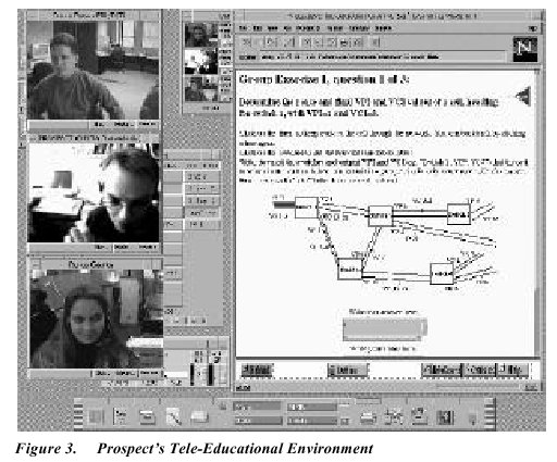 Access to the two courses was provided from a tele-educational desktop environment. On entering the system, a student is presented with a floorplan that shows a lecture hall, a self-study room, a group exercise room, and a set of tutors’ offices. When a student enters a particular room, an appropriate set of support applications are launched to allow the desired interaction to take place. For example, entering a group exercise room starts an audio and video conference between the people in the room, and a shared whiteboard application showing the exercise to be completed is also launched. The students can then communicate in a whole set of modalities while attempting to solve the exercise. Figure 3 shows three students working together in such an environment.