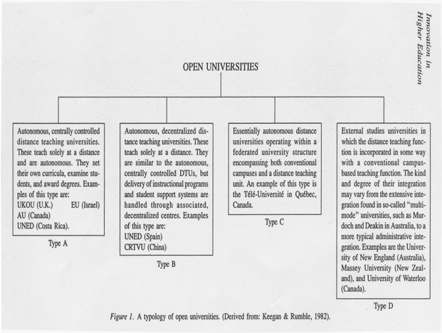 For the purposes of this paper, the institutions of interest will be the autonomous distance teaching universities represented by categories A and B in Figure 1. These universities have been selected because, as distance teaching universities (DTUs) they typically embody more open features than do other universities that might also claim to be open. As Neil points out, “...openness of access is positively and highly correlated with the extent to which an institution is dedicated to distance learning” (1981, p. 37). Moreover, the DTUs were selected because they are fully autonomous in the sense that they have complete control over their curricula and the awarding of degrees. As a consequence, it is possible to look at innovative practices and their effects in these universities without the kind of confounding that could occur when similar practices are introduced into the context of the conventional university.