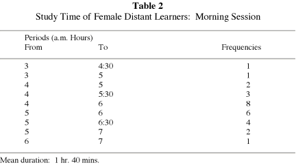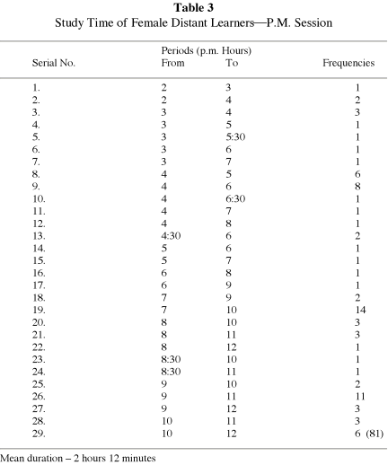 Far more women were able to study in the evening. As shown in Table 3, however, the length of evening study sessions varies from one to four hours, with more than 56% of the sample typically studying for approximately two hours. This figure is in keeping with the calculated mean of 2 hours 12 minutes reported in Table 3.