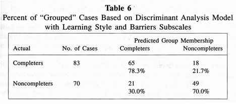 69.93%, with 79.5% of completers and 58.6% noncompleters correctly classified (again recall the concern relative to upward biases). It should be noted that Overall Expectancy of Success alone resulted in correct classification of 68.7% of completers and 60% of noncompleters for an overall rate of 64.71%. (For further discussion see Coggins, 1988.) In further analysis, multiple regression procedures determined that only small amounts of variance in barriers could be explained by the learning style subscales. More specifically, reading accounted for 12% of the variance, expectancy and goal setting explained an additional 6% and 4% respectively.