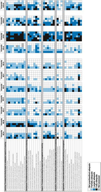 Looking at the column for a single institution visualised in Figure 3, such as that for University NZ-B, shows that while some groups of processes are relatively strong (such as the block of Learning processes at the top), others (such as the Support and Evaluation processes) are not. This information can start to guide managers and leaders towards areas that may require prioritisation, with the benefit of being visually clear to most audiences when explaining the rationale for focusing on those issues.
