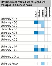 The assessment information can also be displayed on an individual process basis to highlight issues that may be common across all institutions. The results for these institutions for Process D7 (E-learning resources are designed and managed to maximise reuse) are shown in Figure 5. This clearly shows that even in institutions that are otherwise very capable (such as university UK-B) this process is not one with strong capability. This is consistent with the observation that despite the obvious attraction of reuse on cost and efficiency grounds, large-scale adoption of reuse approaches such as Reusable Learning Objects has not occurred (Barker et al. 2004). This suggests that the conception of reuse in the literature has not been persuasive and that in reality a number of significant barriers to the creation, storage and reuse of educational materials remain.