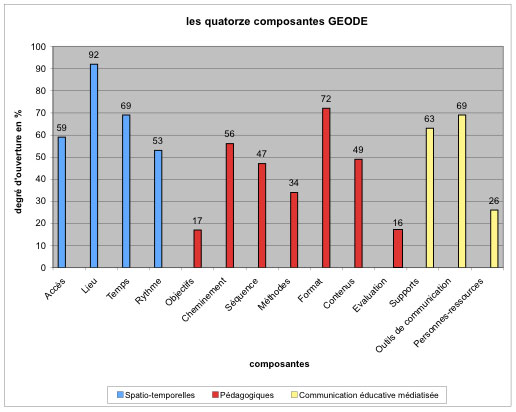 L’étape 4 du protocole de traitement des données (voir tableau 6 ci-dessus) montre que les scores obtenus par composante permettent de calculer le degré d’ouverture de la catégorie à laquelle elles se réfèrent,5 c'est-à-dire spatio-temporelles, pédagogiques ou de la communication éducative médiatisée. Le degré d’ouverture de chaque catégorie s’obtient en effectuant la somme des scores des composantes liées à cette catégorie puis en divisant cette somme par celle des scores maximum possibles liés à ces mêmes composantes ; le résultat obtenu étant exprimé ici en pourcentage. À l’étape 5, le degré d’ouverture de l’environnement éducatif étudié s’obtient, quant à lui, en effectuant la somme les scores attribués aux quatorze composantes. Le résultat obtenu, référencé à une base 100, exprime ce degré d’ouverture en pourcentage. Cette base 100 correspond ici à la somme des scores maximum possibles soit 157,6.