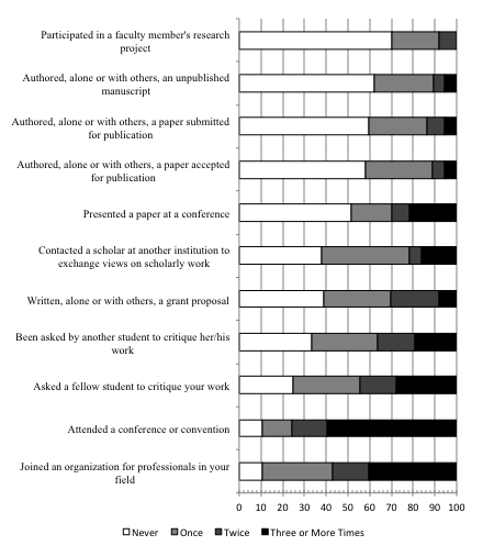 Figures one presents the students’ responses to the 11 items comprising participation in scholarly activities. Less than half of the students have ever participated in a faculty member’s research project, authored a manuscript (published or not), or presented at a conference. Students were more likely to participate often in less demanding scholarly activities, such as attending a conference or joining a professional organization. (See figure 1).