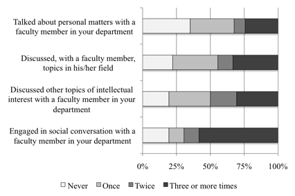 Figure two presents the students’ responses to the four items comprising student-to-faculty interaction. Many of the students engaged in social conversation with faculty members but far fewer went any deeper to discuss topics in their field or talk about personal matters. (See figure two).