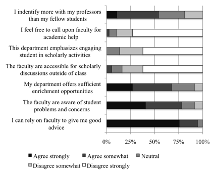 Figure four presents the students’ responses to the seven items comprising supportive faculty environment. Consistent with the finding that few students went beyond social conversations with their instructors, most did not agree that faculty members were available for help, engaged them in scholarly activities, or were accessible outside of class. (See figure four).