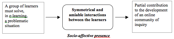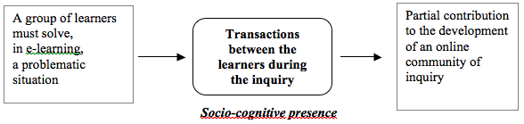 Given these factors, socio-cognitive presence is characterized as follows: “socio-cognitive presence in e-learning results from existing transactions between learners to jointly solve a shared problematic situation. Transactions are social interactions of divergent points of view, mutual adjustments, negotiations and deliberations. This socio-cognitive presence, in turn, contributes to the emergence and development of an online community of inquiry” (Jézégou, 2012).