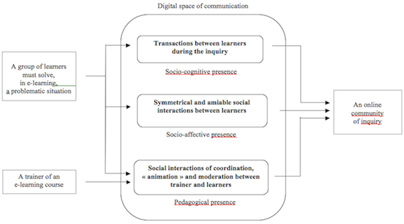 When learners come together to solve a problem, each of the four phases of the practice of inquiry requires transactions between learners (Dewey & Bentley, 1949). Learners express their differences, their similarities and their distinct points of view. They then collectively adjust, negotiate and interact with one another to define the problem, create possible solutions, choose and test a solution and then finally formulate a conclusion on the results of the experiment. Such transactions show that they are engaged in contradictory collaboration. In the context of e-learning, these interactions generate socio-cognitive presence in the digital space of communication despite the geographical distance between learners.