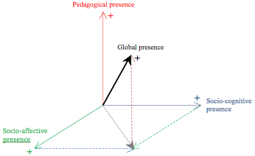 There are three dimensions: socio-cognitive presence (1), socio-affective presence (2) and pedagogical presence (3). The following sections describe what precisely is meant by each aspect of the three-dimensional model of presence, before providing a schematic representation. They also present how these three dimensions can be related to one another and the main hypotheses resulting from these relations.